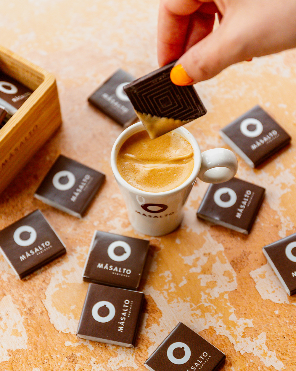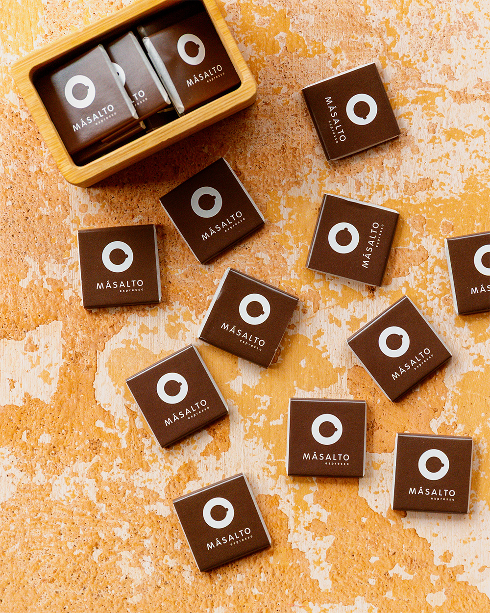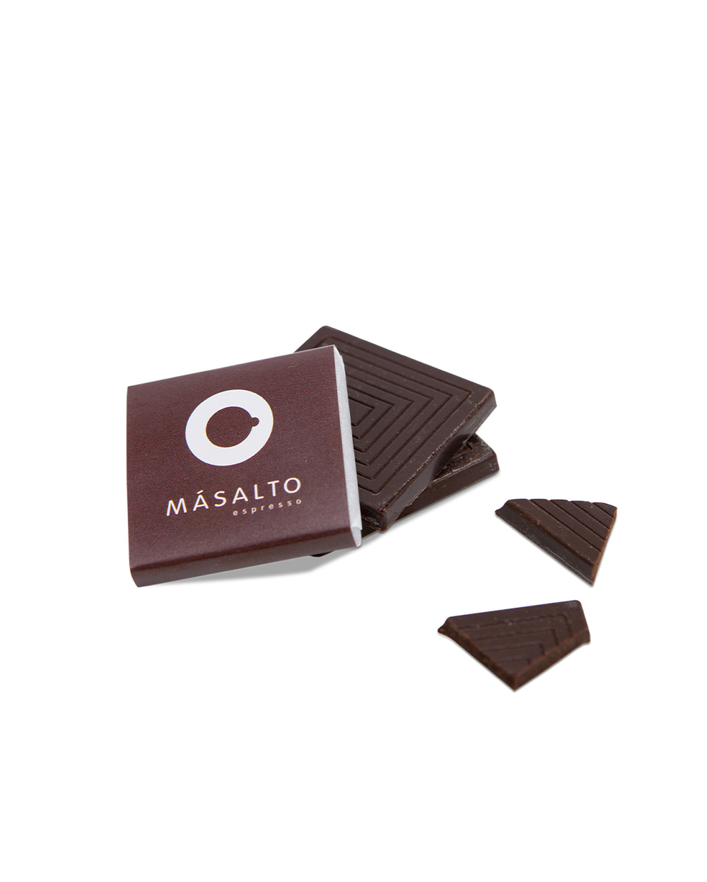 Élaborés par le chocolatier belge Dolfin, les carrés de chocolat noir Másalto contiennent 70% de cacao pour un goût intense et raffiné. Leur longueur en bouche exceptionnelle révèle à merveille les arômes délicats de nos mélanges de café.